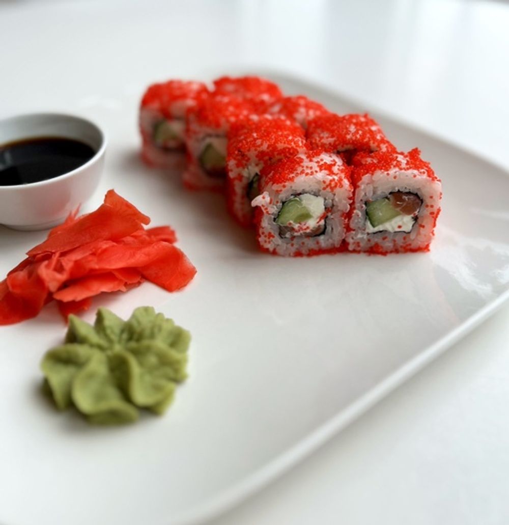 Состав: рис, семга с/с, сыр творожный, огурец, икра масаго