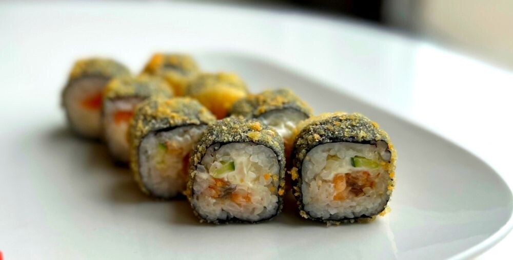 Состав: рис, сыр творожный, копченый угорь, семга с/с, свежий огурец, панировка.