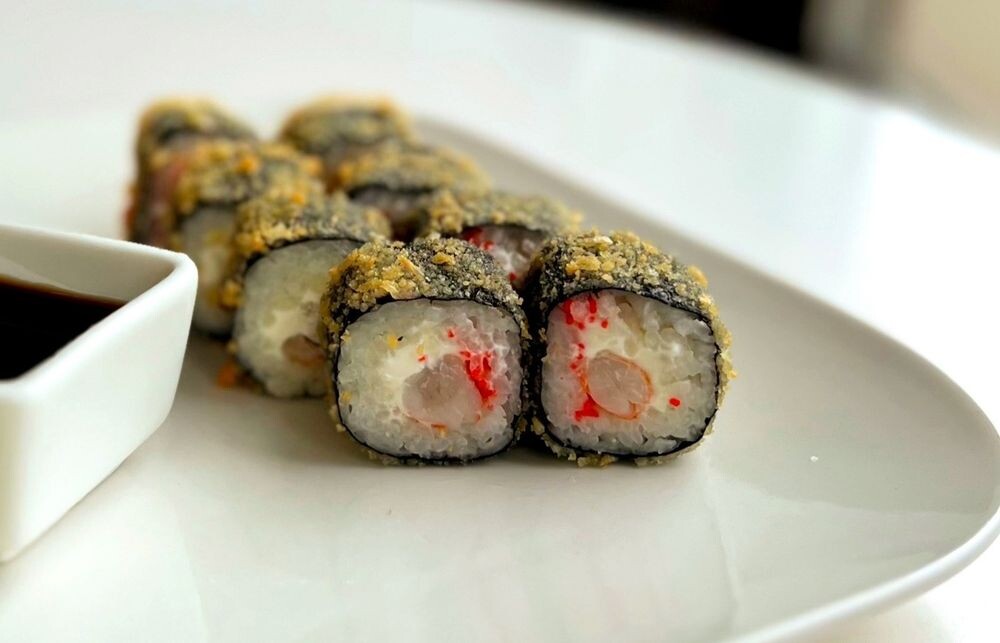 Состав: рис, сыр творожный, тигровые креветки, икра масаго, панировка.