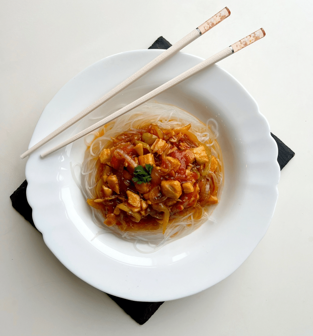 Фунчоза в сливочном соусе с курицей и грибами