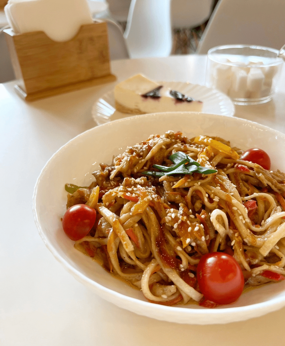 Состав: лапша удон, куриное филе, морковь, перец болгарский, чери, чеснок, сливки, устричный соус, соевый соус, терияки, лук зеленый, кинза, кунжут.