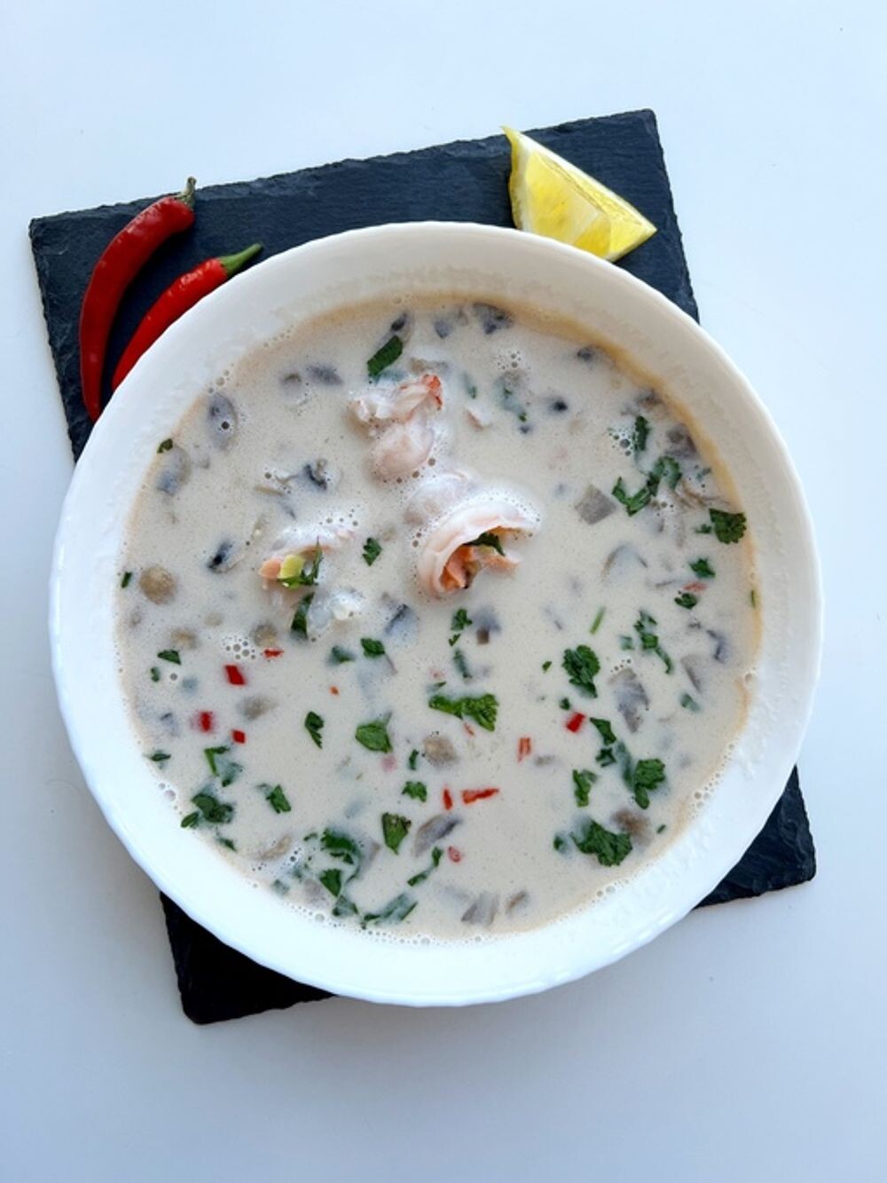 Состав: кокосовое молоко, семга, креветки тигровые, шампиньоны, имбирь, сок лимона, перец чили