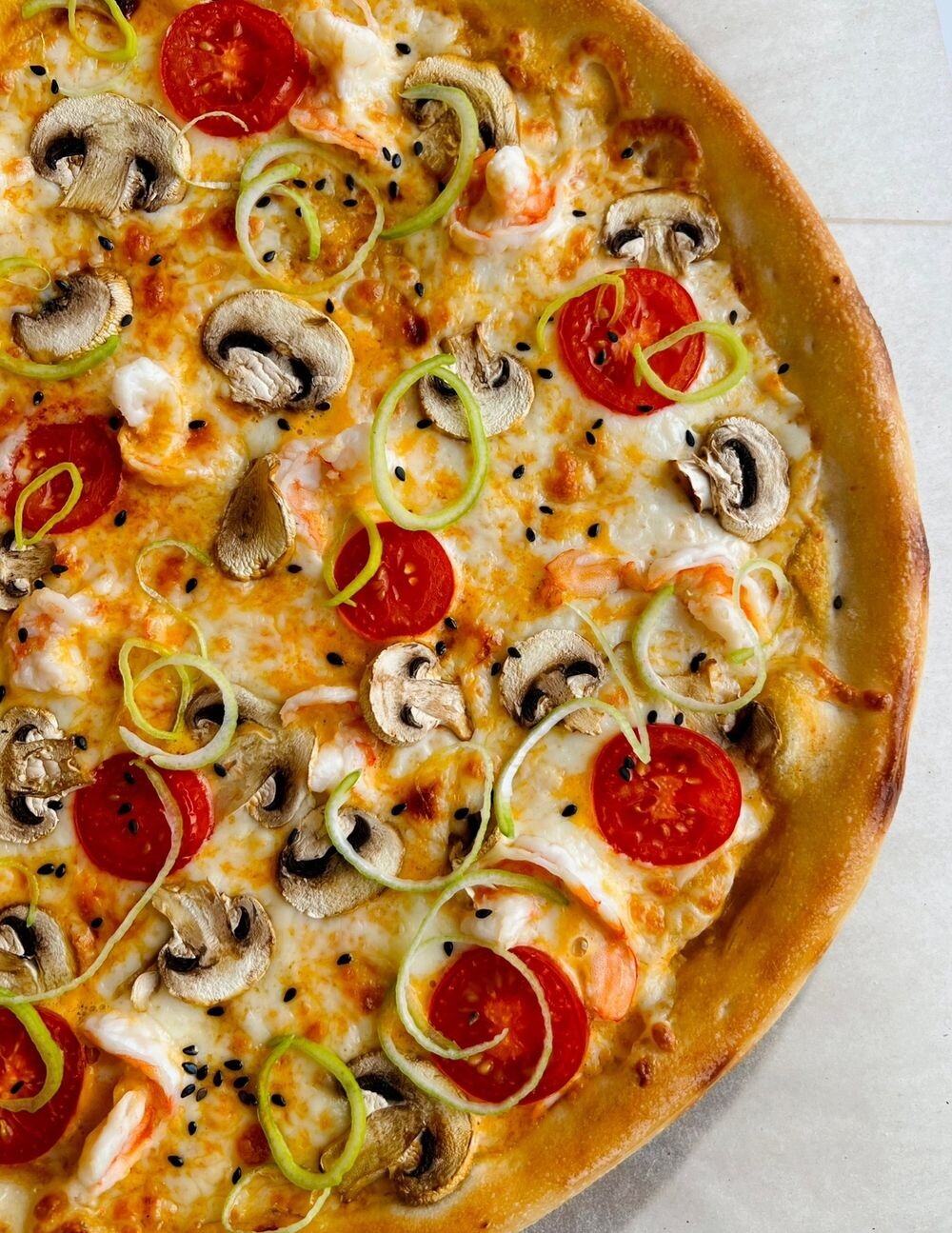 Состав: тесто, моцарелла, соус том-ям, королевские креветки, черри, шампиньоны, лук порей, кунжут