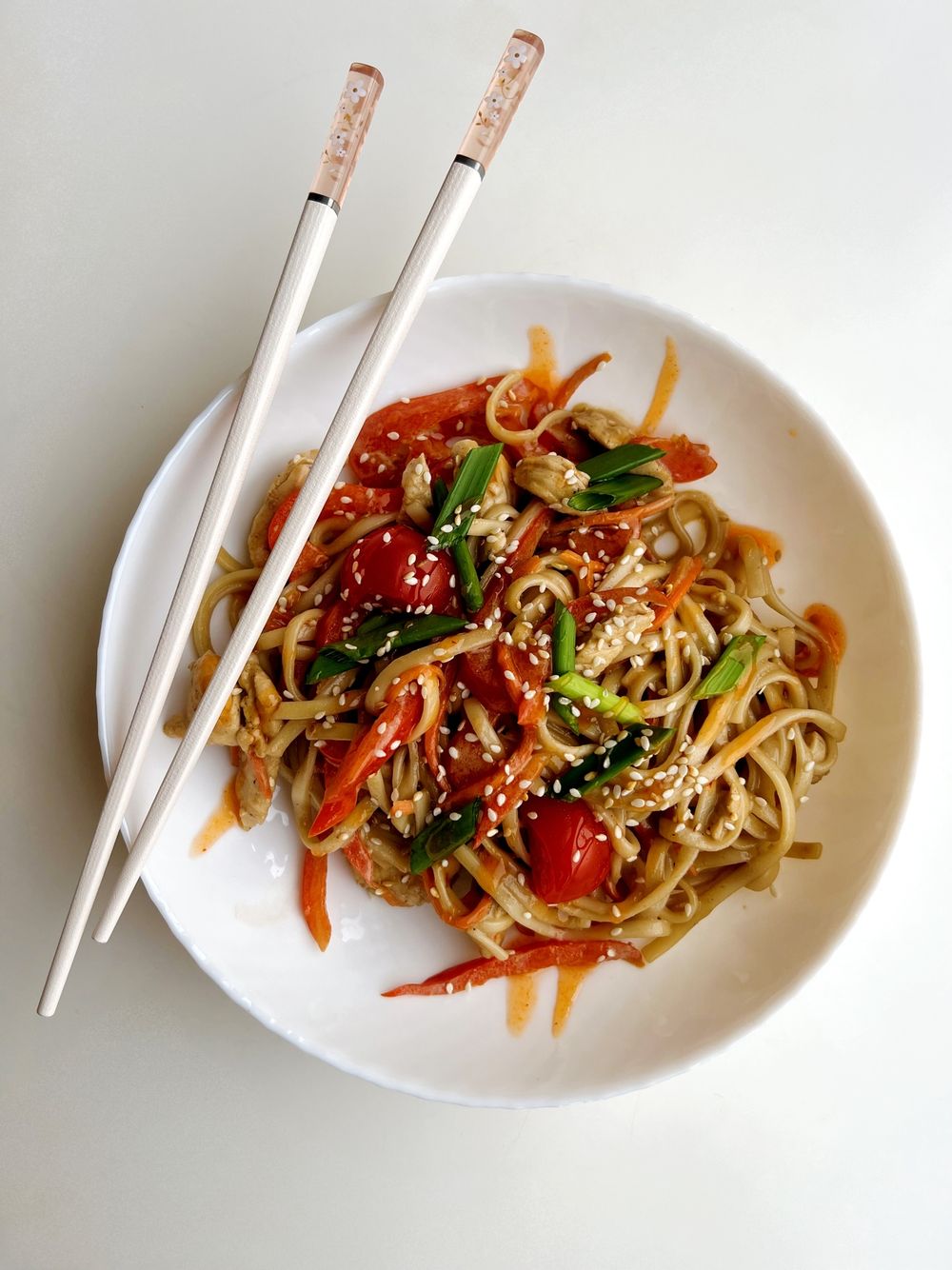 Состав: лапша удон, куриное филе, морковь, перец болгарский, морковь, черри, чеснок, сливки, устричный соус, соевый соус, манговый соус, кунжут.