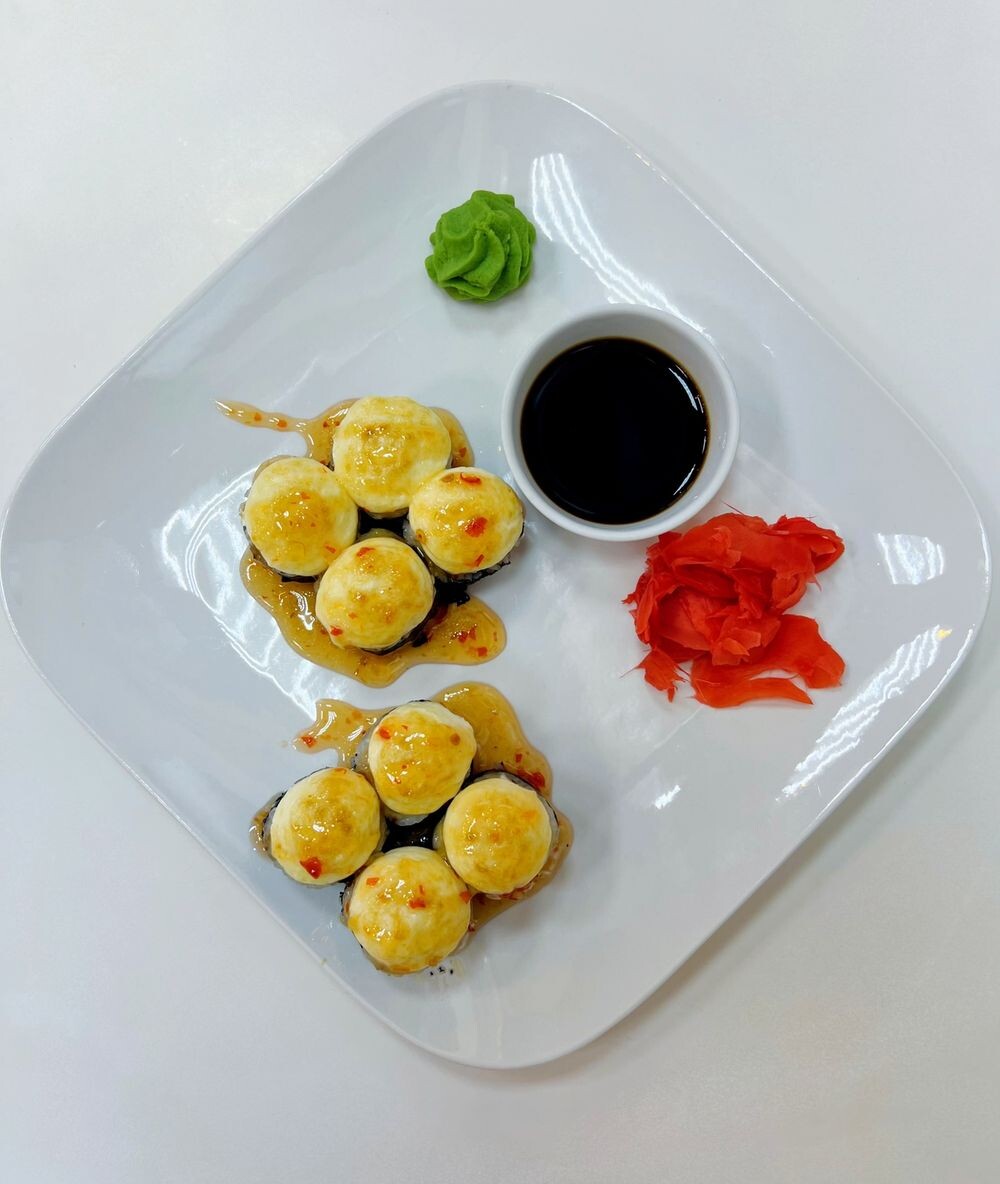 Состав: рис, сыр творожный, обжаренные в кляре креветки, салат айсберг, сырная шапка, соус сладкий чили