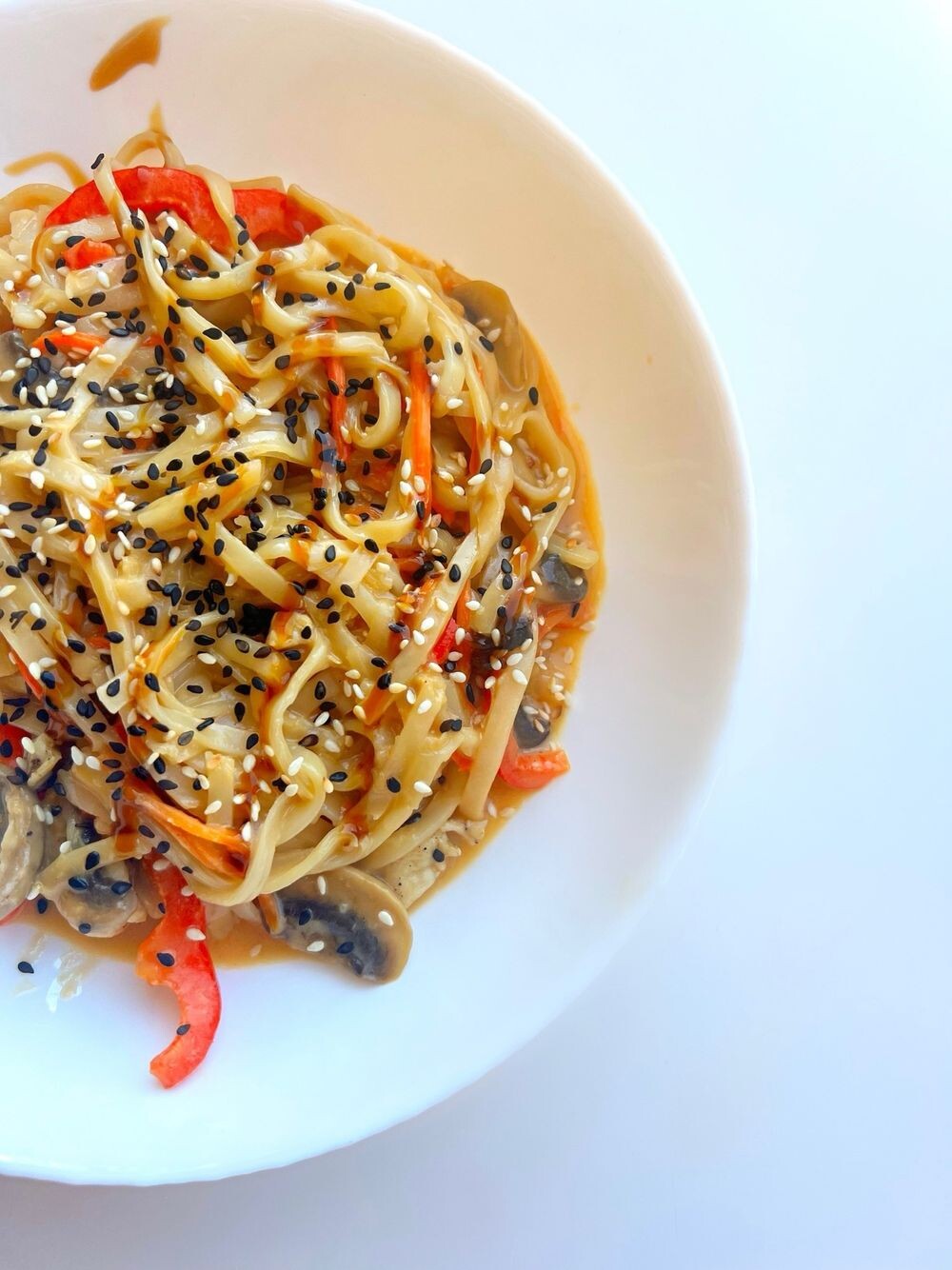 Состав: удон, куриная грудка, кокосовое молоко, шампиньоны, болгарский перец, морковь, устричный соус, терияки соус, кунжут