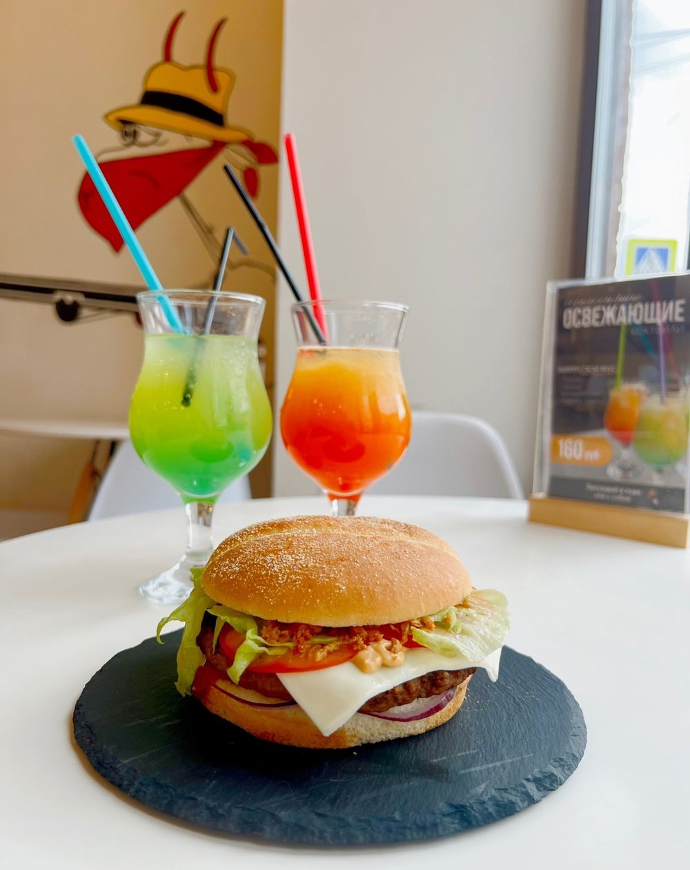 Состав: булочка, большая котлета из 100% мраморной говядины, томаты, лук красный, кетчуп, соус гриль, соус горчичный, салат айсберг, ломтик плавленного сыра, лук фри