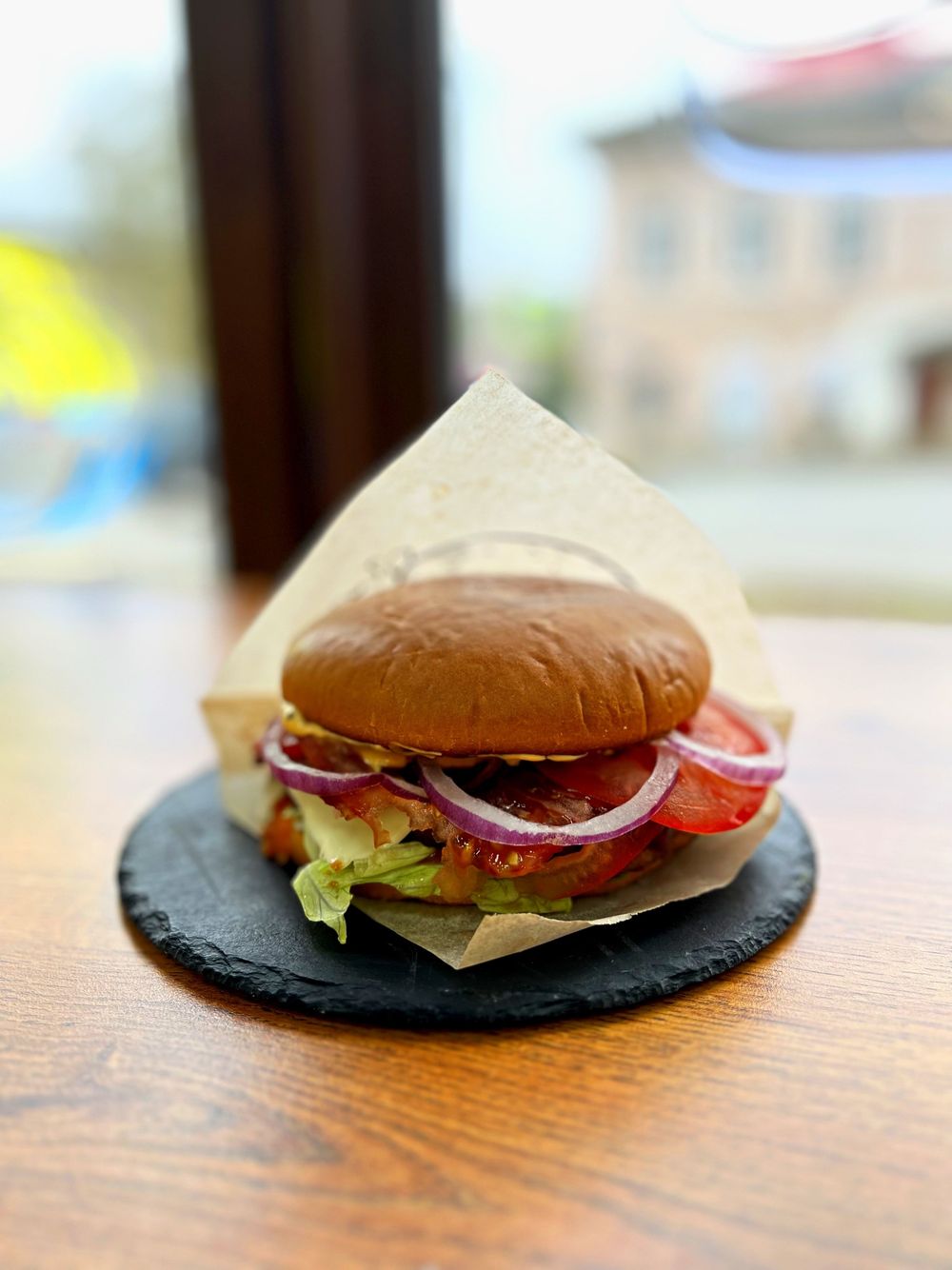 Состав: булочка, большая котлета из 100% мраморной говядины, томаты, бекон, кетчуп, соус барбекю, соус бургер, салат айсберг, красный лук, ломтик плавленного сыра