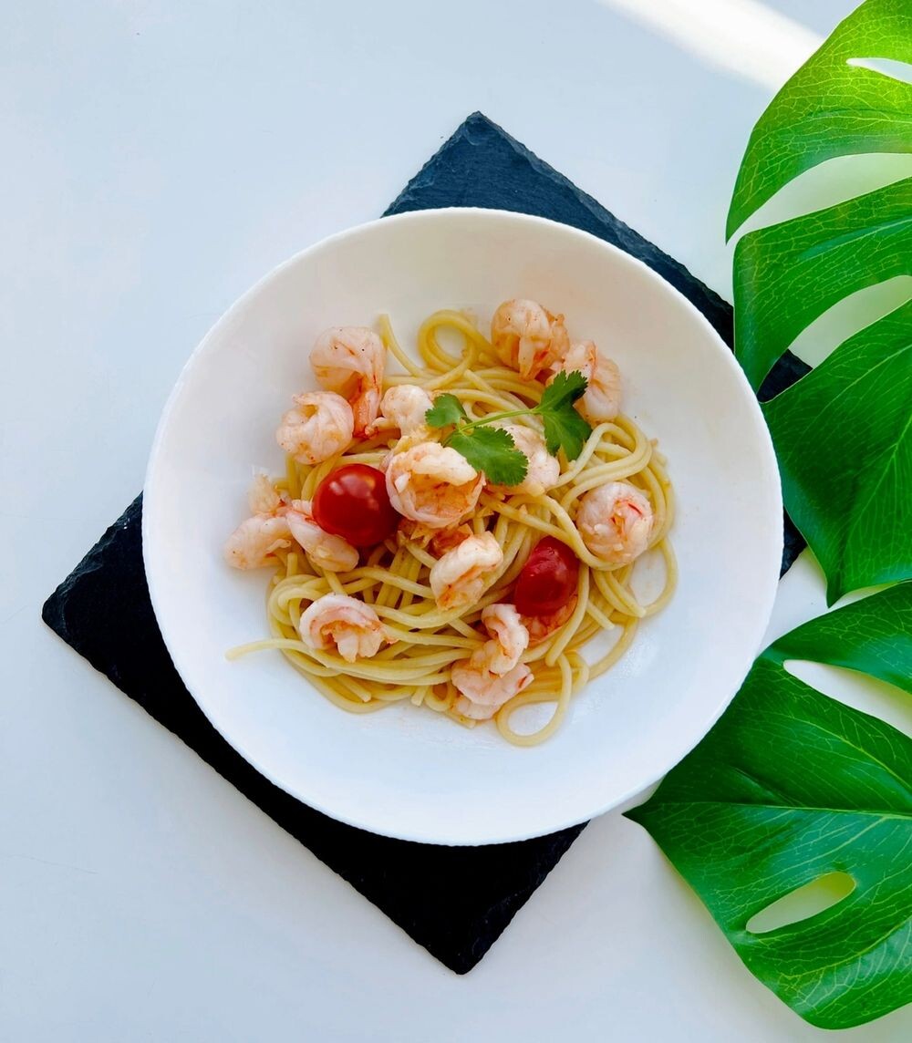 Состав: спагетти, тигровые креветки, соус шрирача, помидоры черри, сливочное масло, чеснок, зелень, прованские травы.