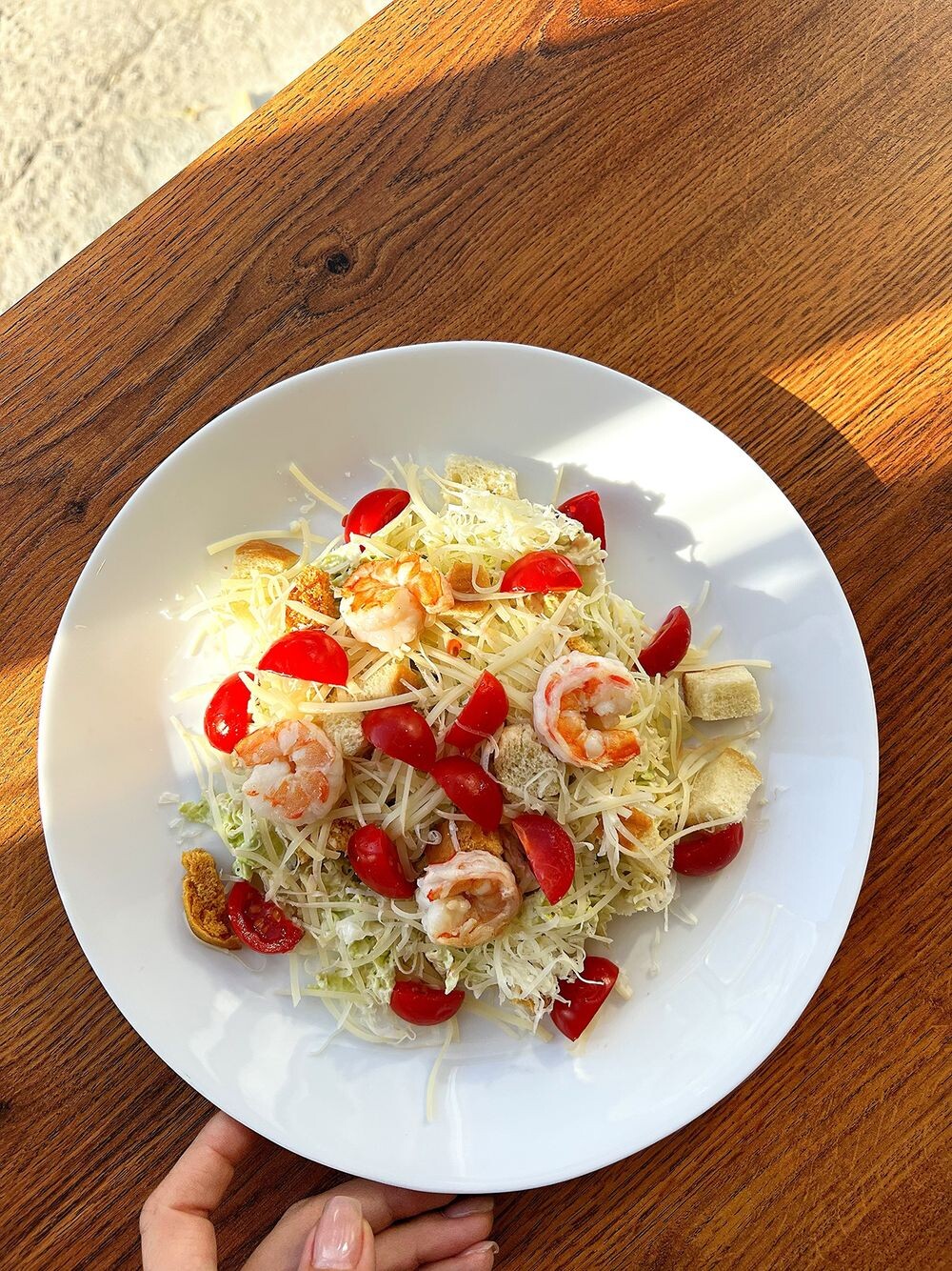 Состав: пекинская капуста, тигровые креветки, чери, соус цезарь, чеснок, сухарики, пармезан.