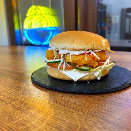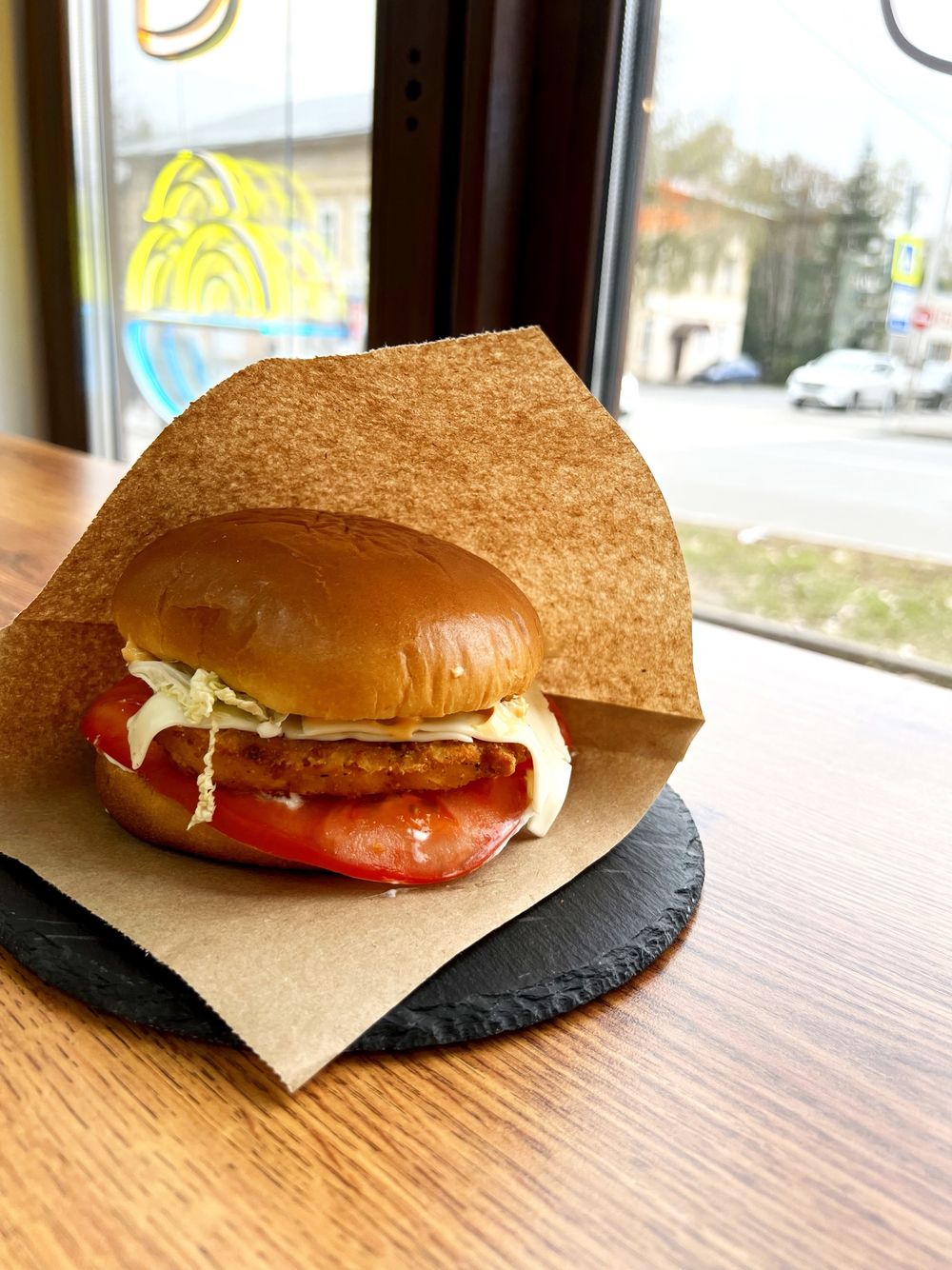 Состав: булочка, куриные стрипсы, соус бургер, соус ранч, помидоры, пекинская капуста, ломтик плавленого сыра, лук криспи