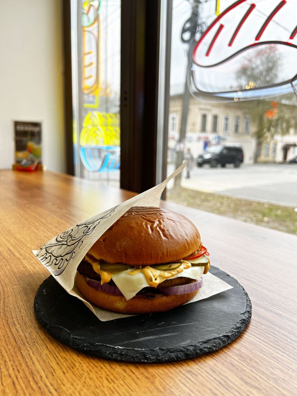 Состав: булочка, большая котлета из 100% мраморной говядины, соус бургер, соус горчичный, соус спайси, помидоры, огурчики маринованные, ломтик плавленного сыра, лук красный