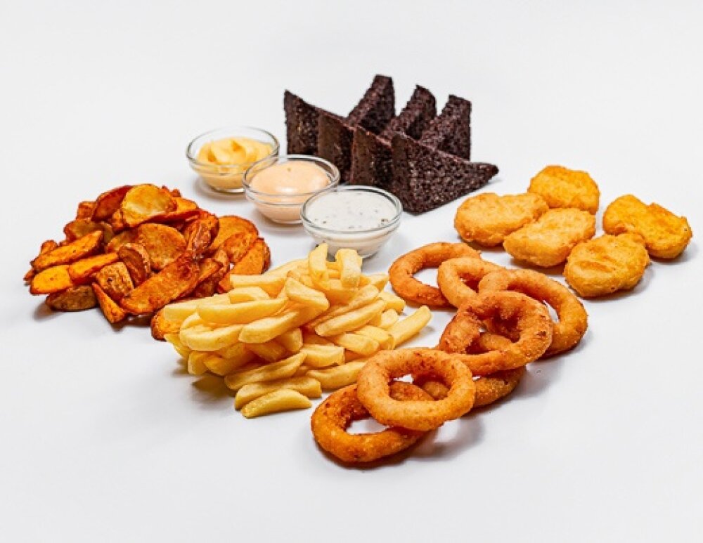 Картофель фри 100г, наггетсы 6шт, картофель по-деревенски 100г, сырные палочки 6шт, луковые колечки 6шт Вид готовой продукции может отличаться от рекламного изображения. Соусы в набор не входят