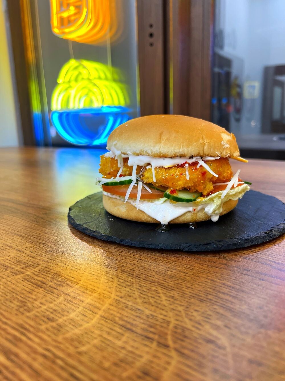 Состав: булочка, креветки термура, соус «Цезарь», соус «Ранч», помидоры, свежий огурец, пекинская капуста, соус сладкий чили, ломтик плавленного сыр, сыр «Пармезан»