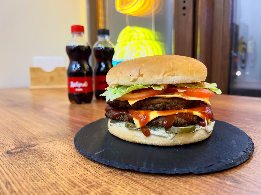Состав: булочка, две больших котлеты из 100% мраморной говядины, соус армянский, соус гриль, маринованный огурчик, ломтик плавленного сыра, помидор, салат айсберг