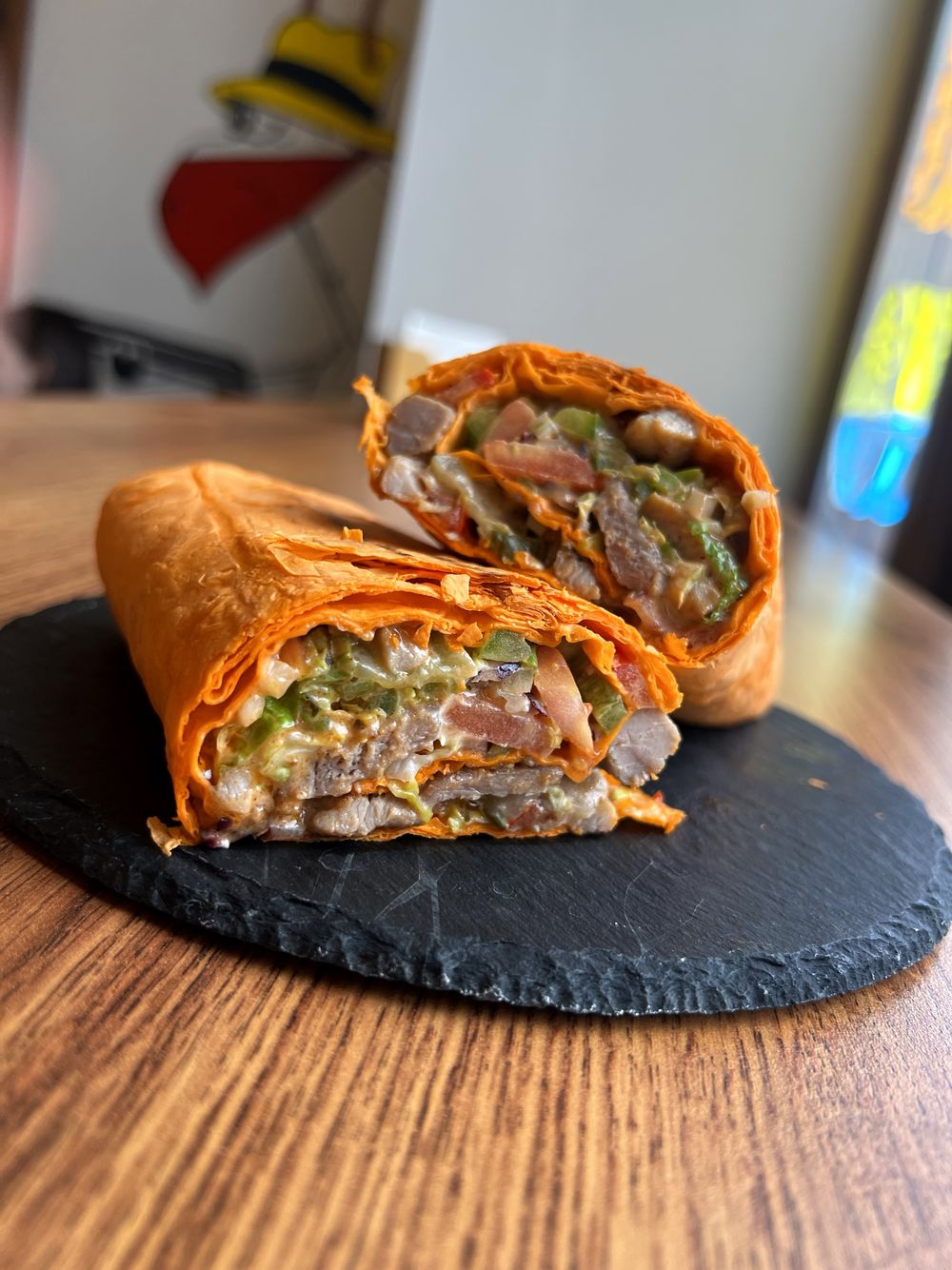 Состав: свинина, помидоры, пекинская капуста, огурцы маринованные, красный лук, болгарский перец, фирменный соус, аджика соус(не острый)