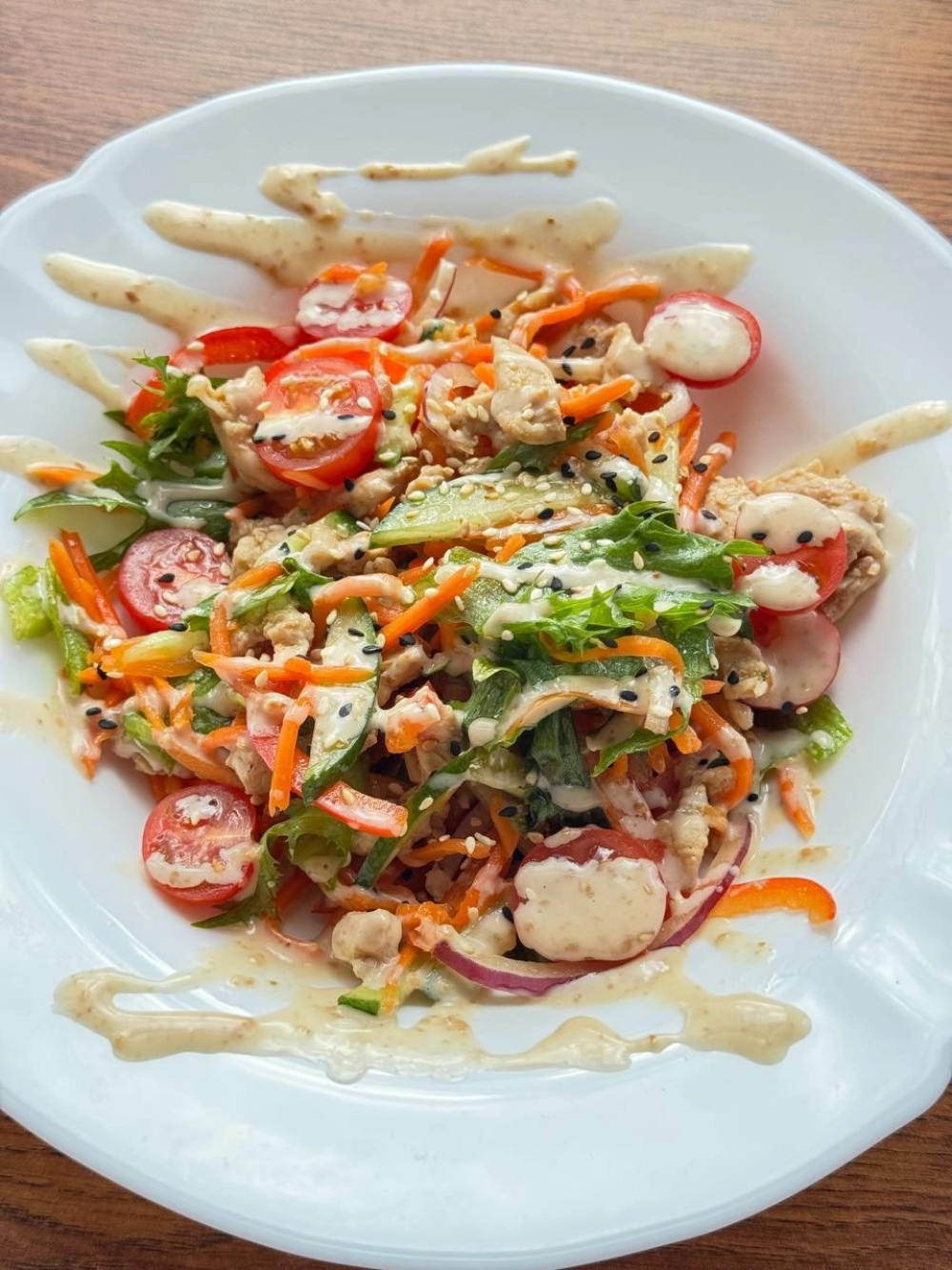 Состав : листья салата, куриное филе, морковь по-корейски, огурец, болгарский перец, красный лук, черри, соевый соус, ореховый соус