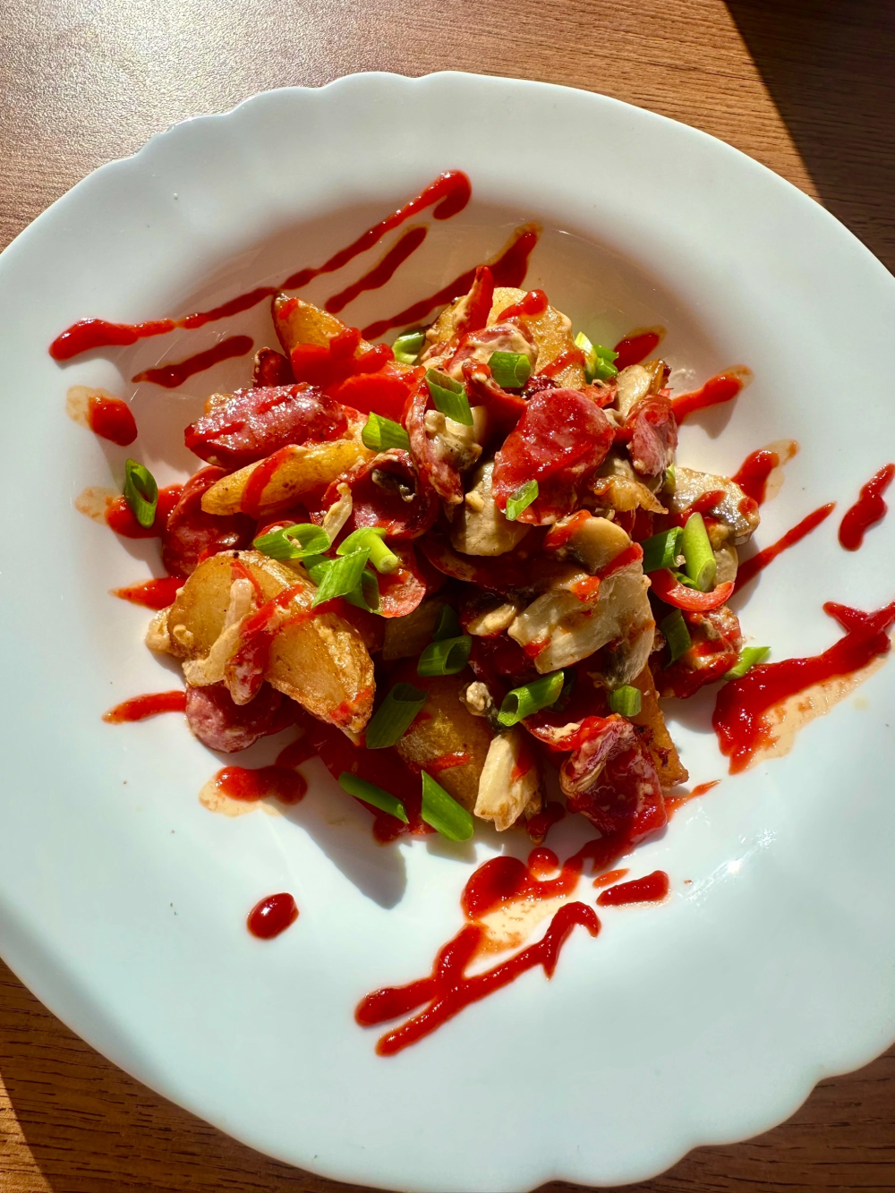 Состав: картофельные дольки, шампиньоны, охотничьи колбаски, болгарский перец, репчатый лук, острый соус