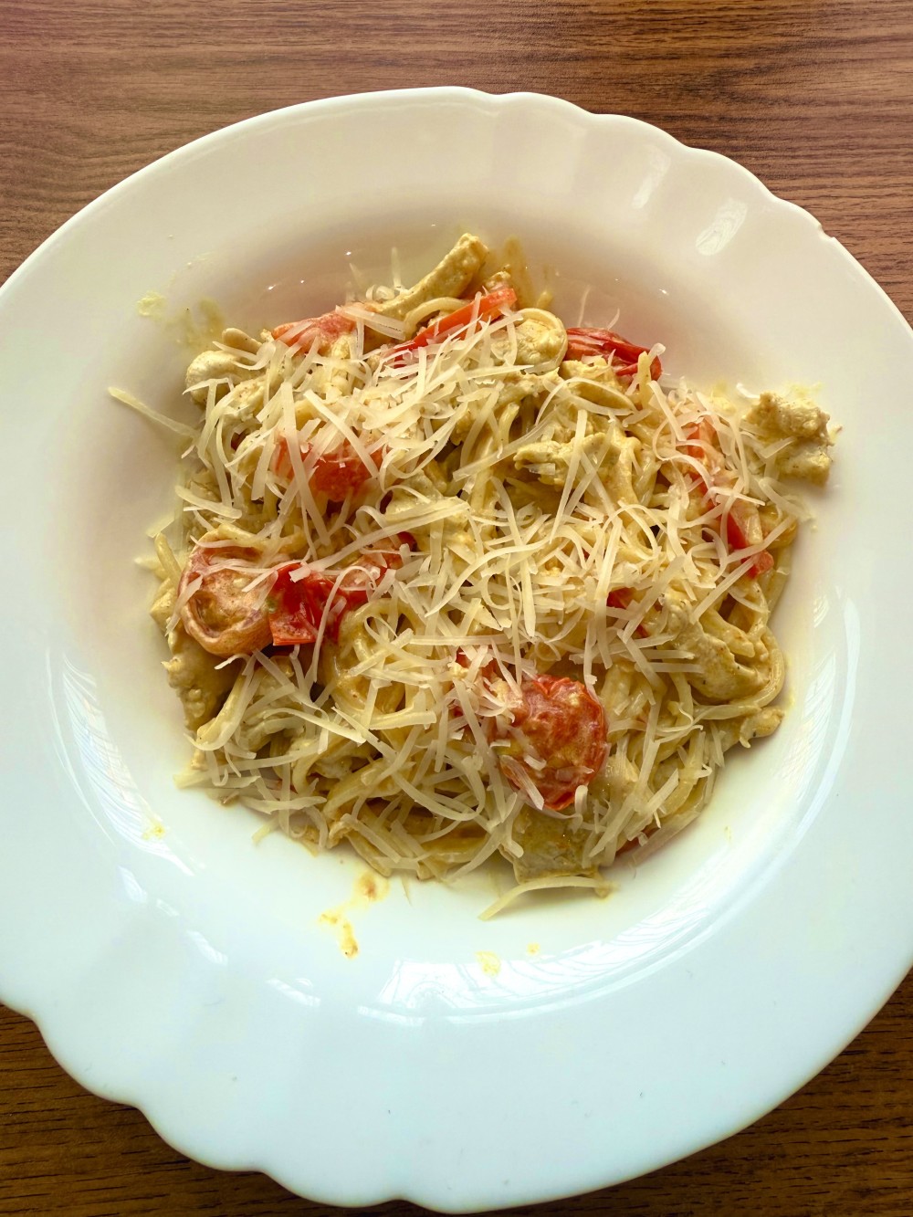 Состав: спагетти, маринованная куриная грудка, болгарский перец, помидоры черри, куркума,чеснок, сливки