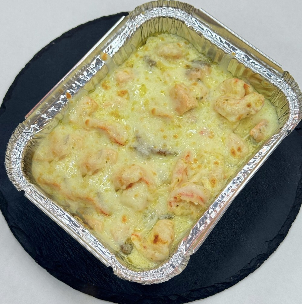 Состав: картофельные дольки, лосось, тигровые креветки, сливки, соус песто, моцарелла