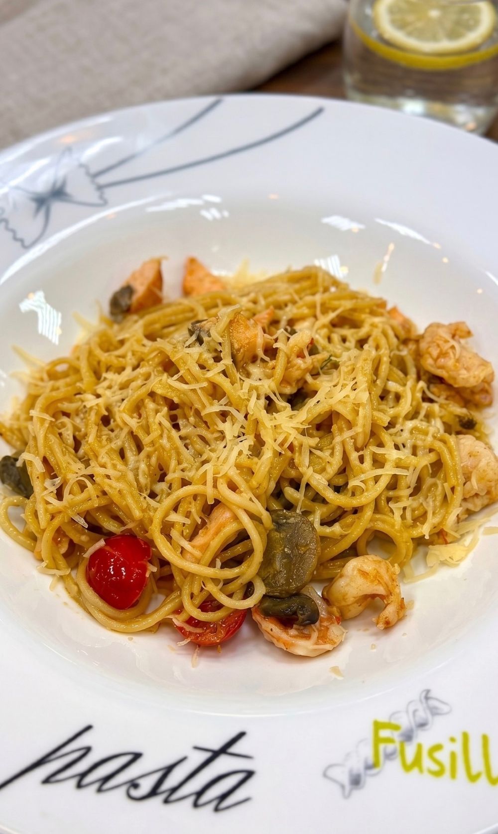 Состав: спагетти, креветки тигровые, семга, шампиньоны, черри, кокосовое молоко