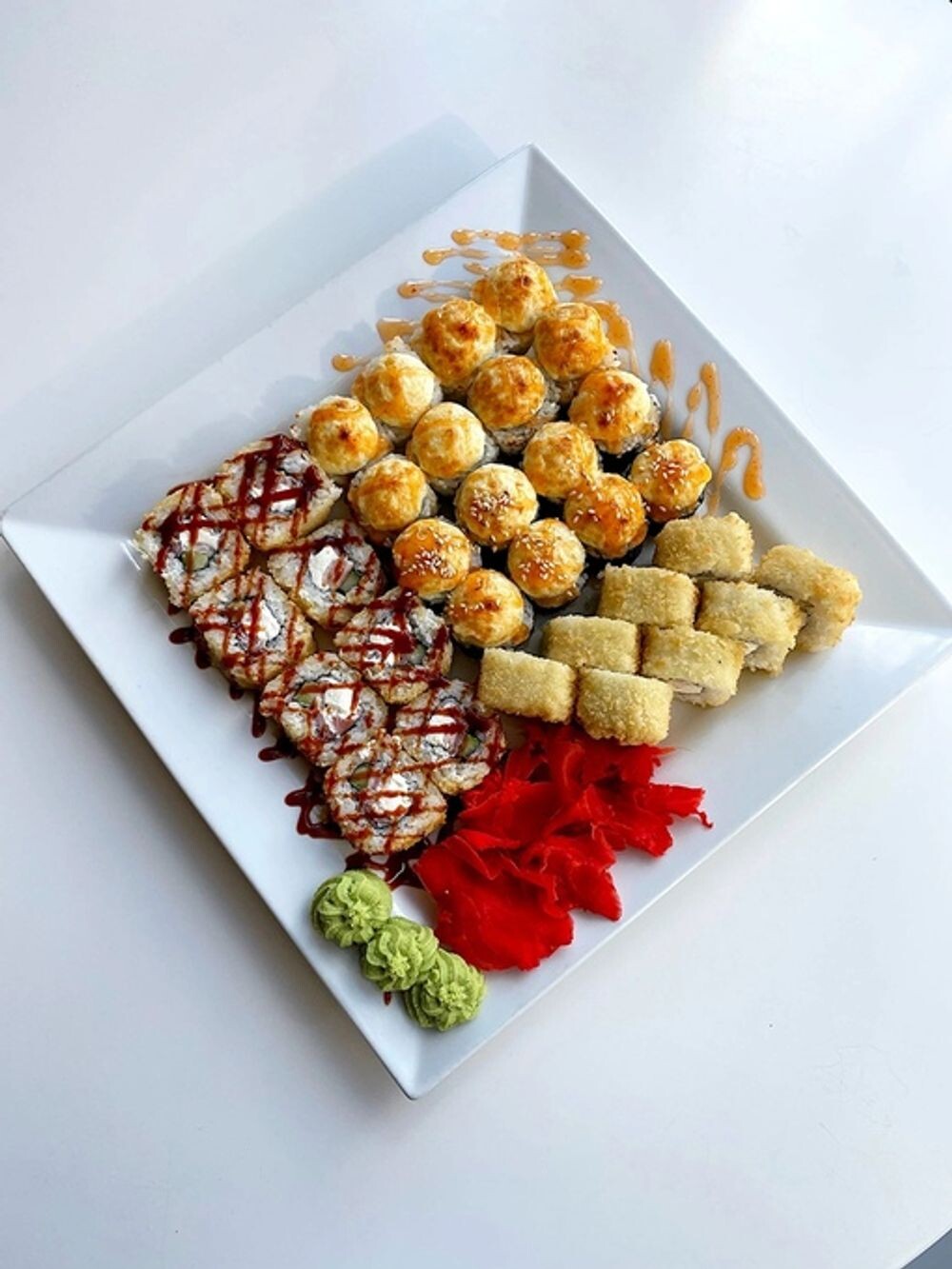 Состав: креветка-манго (креветки+соус манго-чили), Торнадо (угорь+халапеньо), Чикен темпура (куриное филе), Изобилие(семга и креветки)
