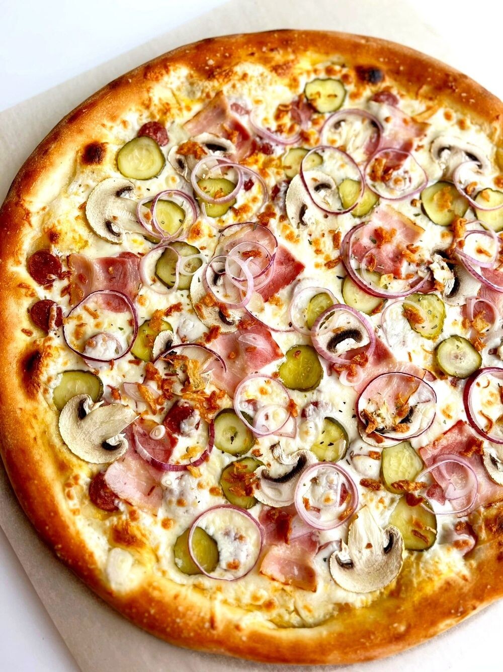 Состав: тесто, моцарелла, горчичный соус, копченые свиные сосиски, охотничьи колбаски, бекон, свежие шампиньоны, маринованные огурчики, лук красный, лук криспи.