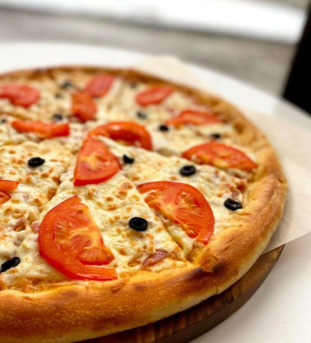 Состав: тесто, моцарелла, фрименный соус, ветчина, помидоры, маринованные шампиньоны, маслины.