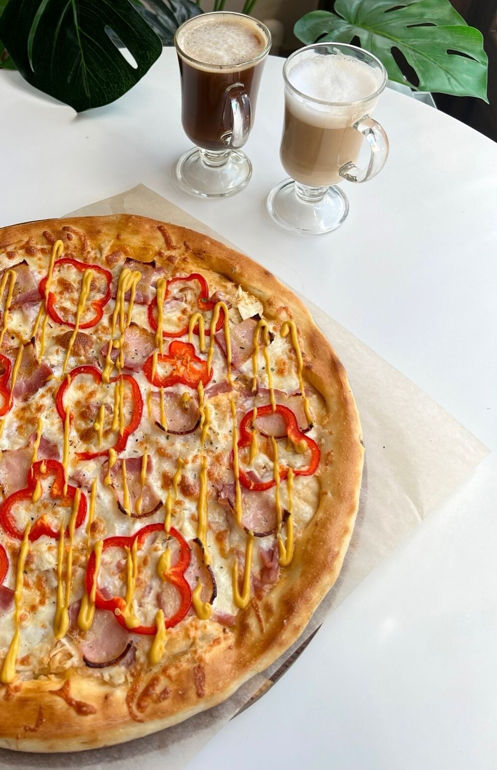 Состав: тесто, моцарелла, фирменный соус, куриное филе, ветчина, бекон, перец болгарский, горчичный соус.