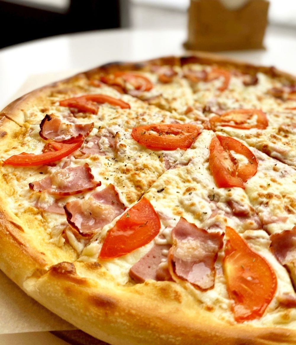 Состав: тесто, моцарелла, фирменный соус, ветчина, колбаса вареная, помидоры, бекон, лук.