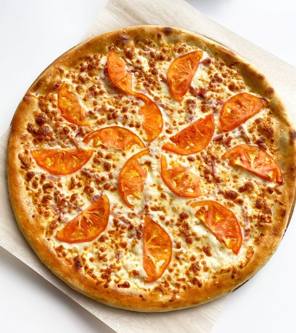 Состав: тесто, моцарелла, фирменный соус, ветчина, помидоры