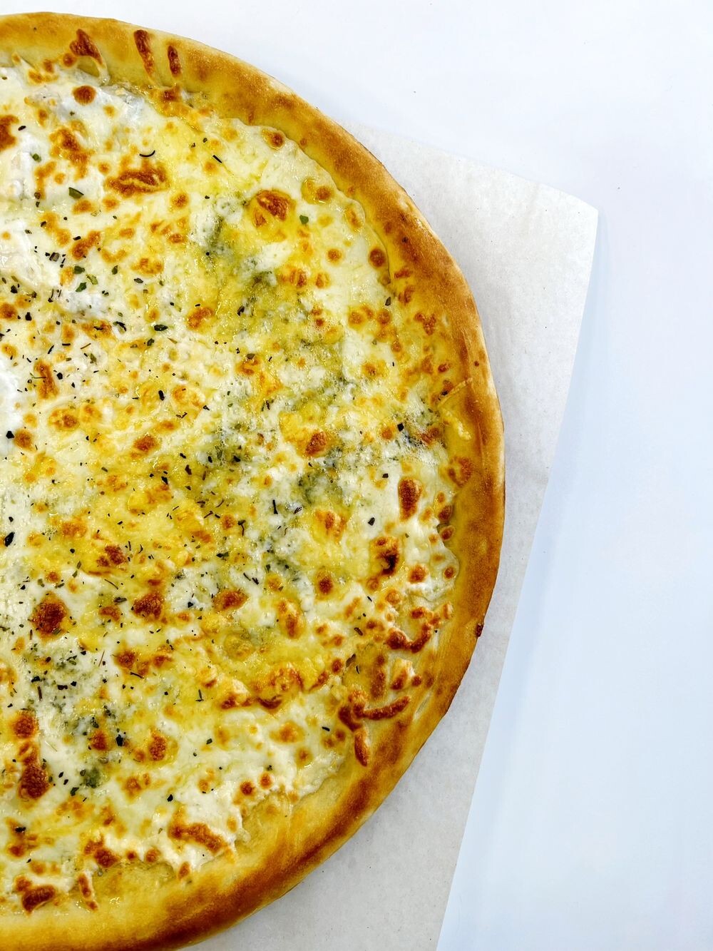Состав: тесто, фирменный соус, сыр Моцарелла, сыр Мраморный, сыр Мон Блю, сыр Пармезан.