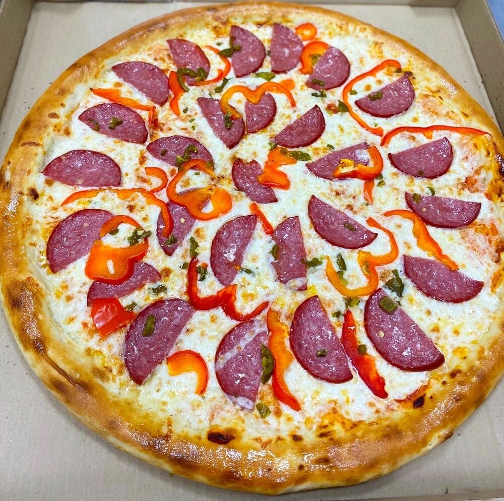 Состав: тесто, моцарелла, красный соус, полукопченая колбаса, перец болгарский, перец халапеньо, перец чили, чеснок.