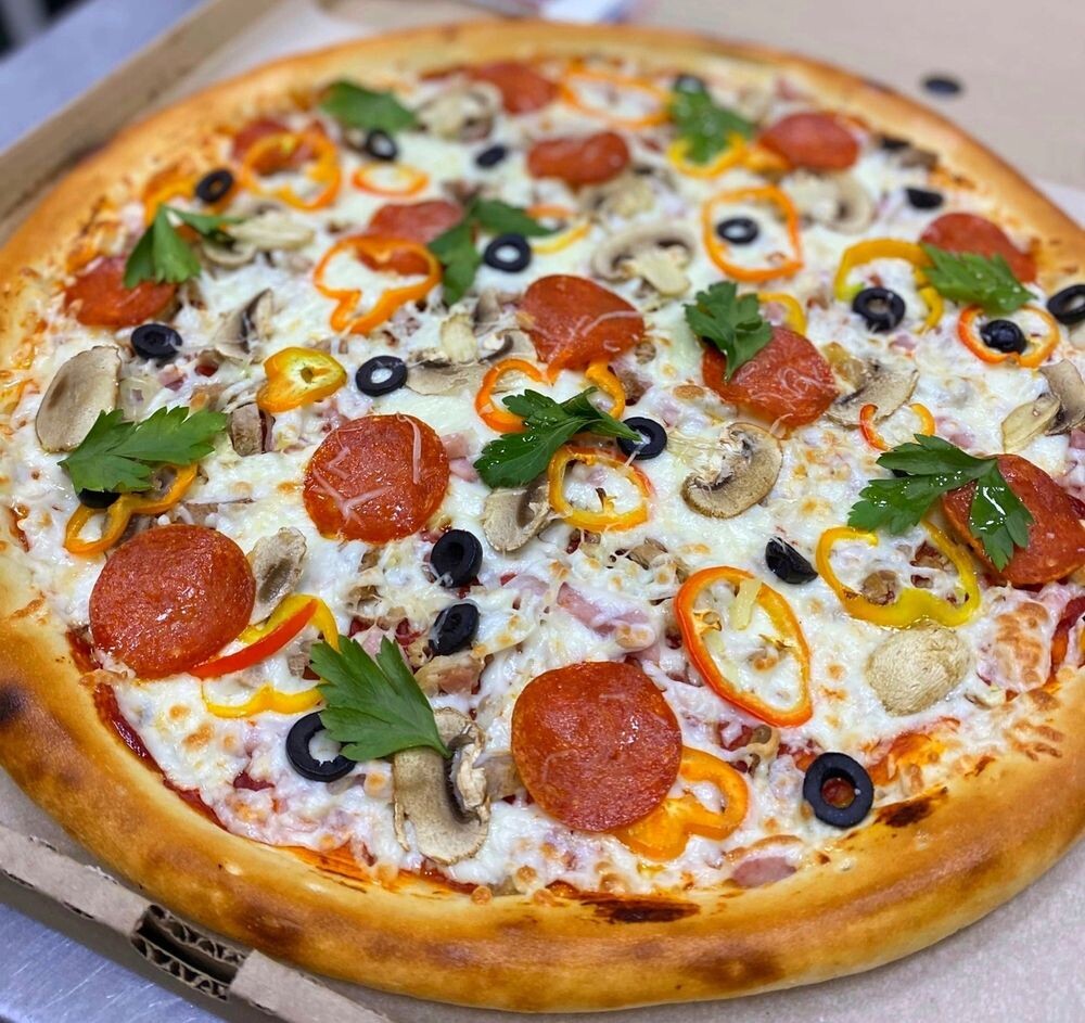 Состав: тесто, моцарелла, красный соус, куриная грудка, ветчина, пепперони, свежие шампиньоны, болгарский перец, лук, маслины, чеснок, пармезан.