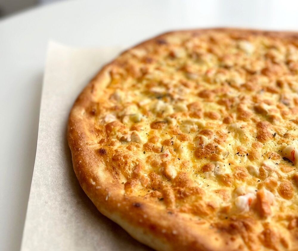 Состав: тесто, моцарелла, соус, семга, креветки, чесночное масло.